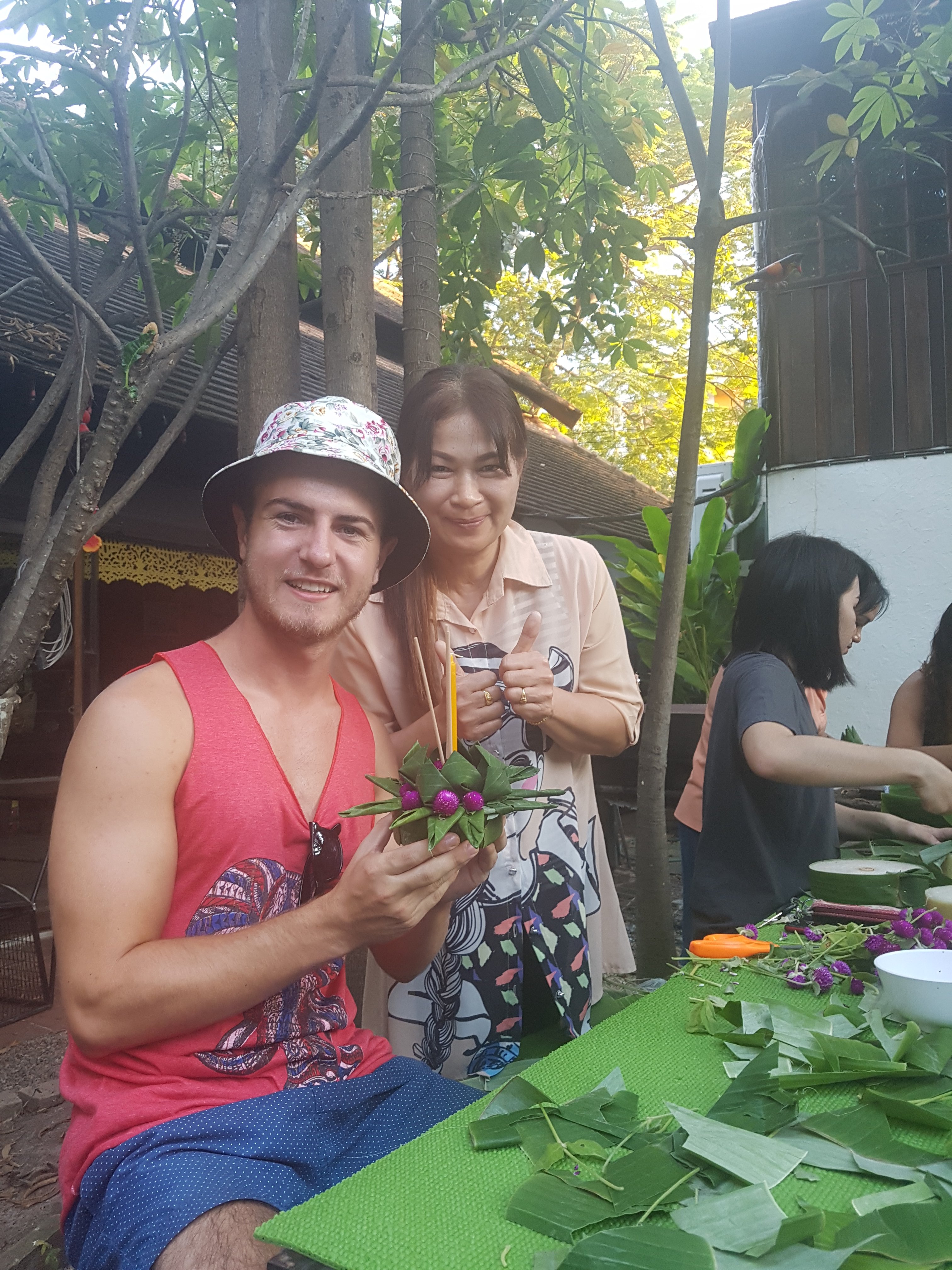 In the afternoon the hostel put on a Krathong making workshop with some of the local Thai ladies to help. It was a really interesting hour or so learning how to make the traditional floating flower displays that get set alight and then sent down the river. I was actually really pleased with how mine turned out and I think even some of the locals were shocked at how good mine looked when finished. Although I must admit I did have help from Conner and a very helpfully Thai lady.